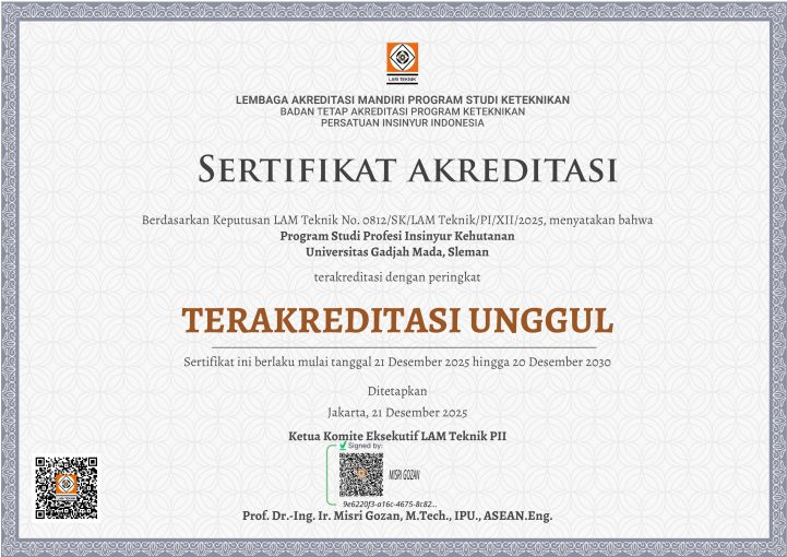 Sertifikat Akreditasi Program Studi Profesi Insinyur Kehutanan (PSPIK) FKT UGM Berita 21 Desember 2025, 10.52 Oleh: aris_purwanto 0